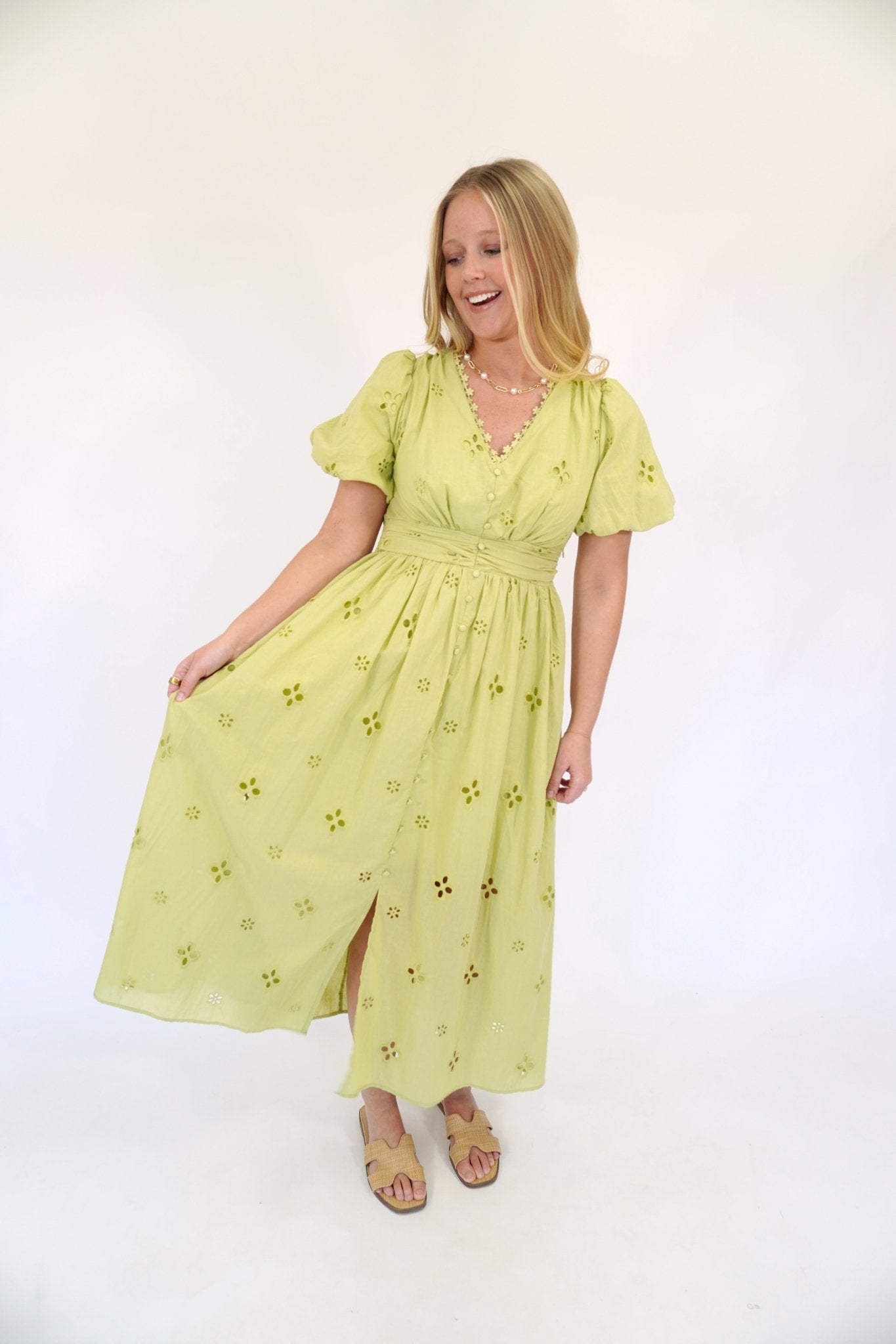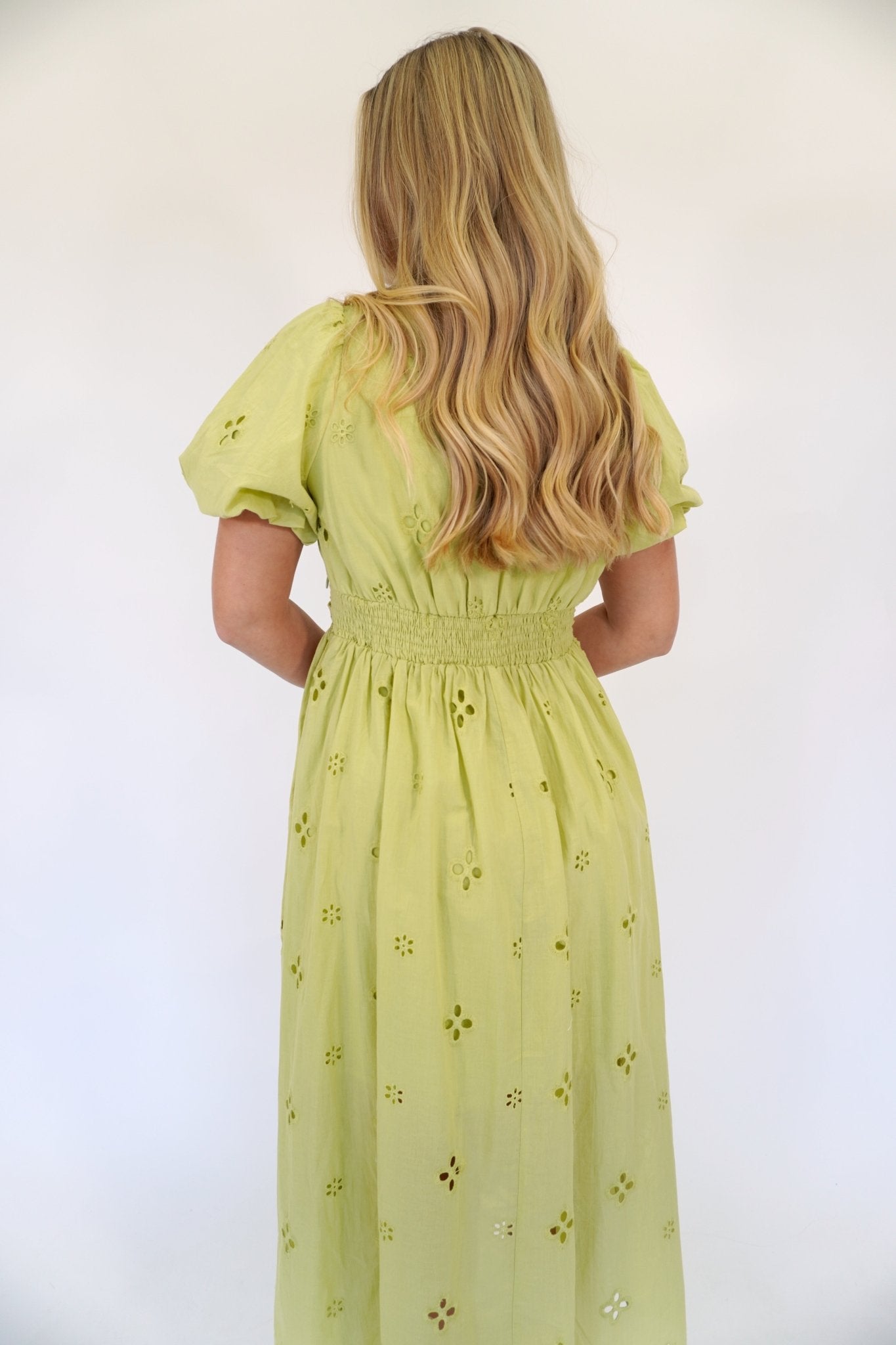 Radiate effortless charm in this breathable cotton eyelet midi dress, featuring feminine puff sleeves and a sophisticated V-neckline. The smocked back waist creates a flattering, custom silhouette while the delicate lace detailing offers timeless elegance for any occasion