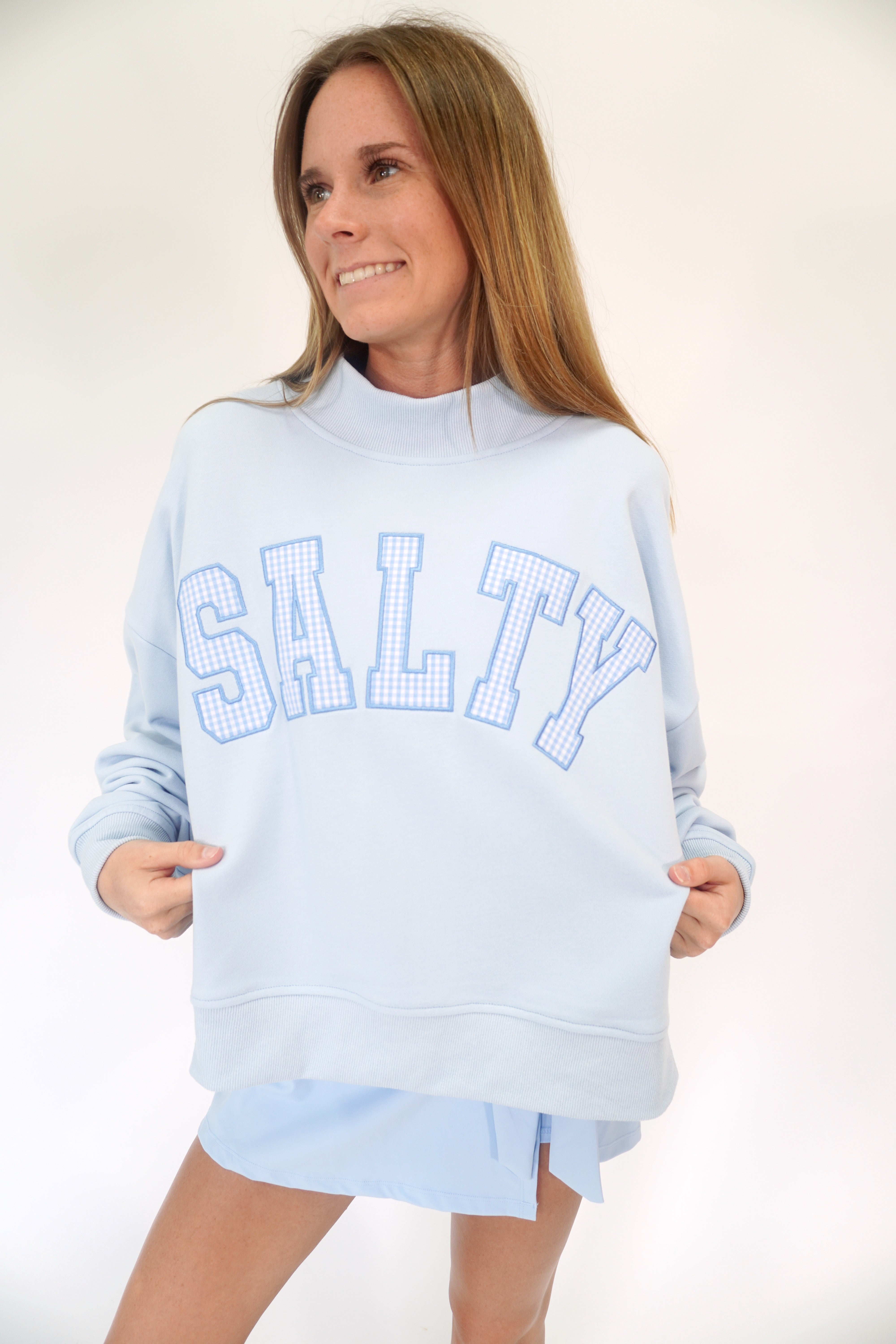 Embrace effortless edge in this ultra-soft, slouchy mock neck pullover. Featuring a bold "SALTY" graphic and premium cotton-blend fabric, it’s the ultimate cozy statement piece for your off-duty rotation.